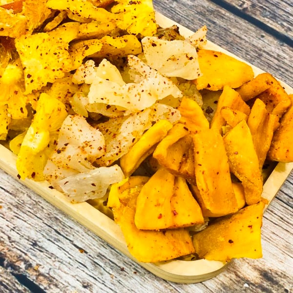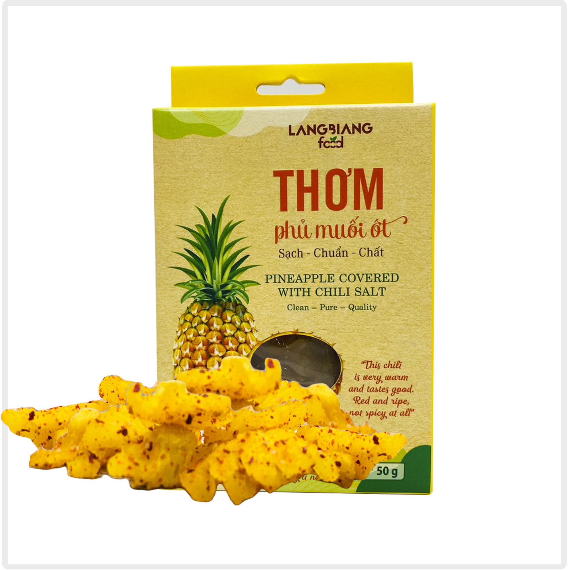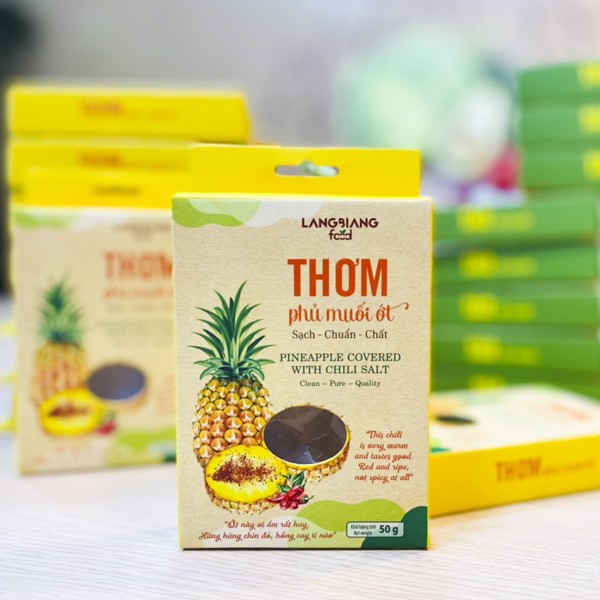 Thơm (dứa, khóm) sấy dẻo phủ muối ớt Langbiang Food được sản xuất với công nghệ sấy lạnh hiện đại, giúp giữ được màu sắc, dinh dưỡng và mùi thơm của dứa. Thơm phủ muối ớt dẻo dẻo, vị ngọt nhẹ, cay the, là món ăn vặt không thể thiếu cho giới văn phòng, đặc biệt rất có lợi cho những người bị viêm xoang dị ứng.Thành phần: